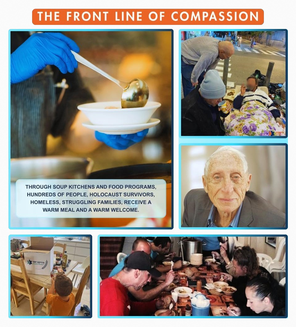 This includes supplying soup kitchens, supporting hot meal initiatives, and providing supermarket vouchers and groceries to hundreds of individuals each day. Those served include the homeless, the elderly, Holocaust survivors, new immigrants, and underprivileged families.